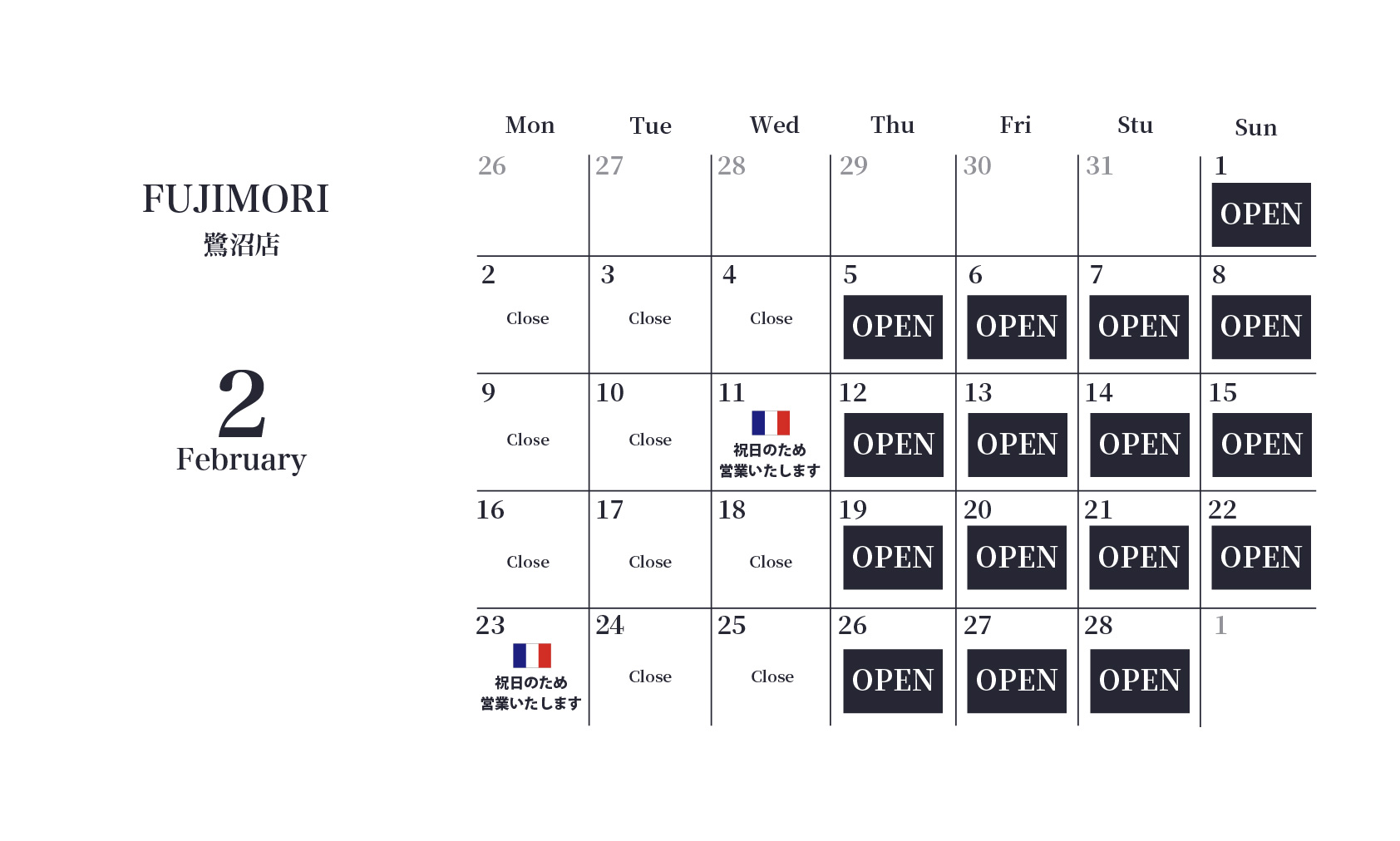 1月・2月の店舗営業スケジュールは以下のとおりとなります。