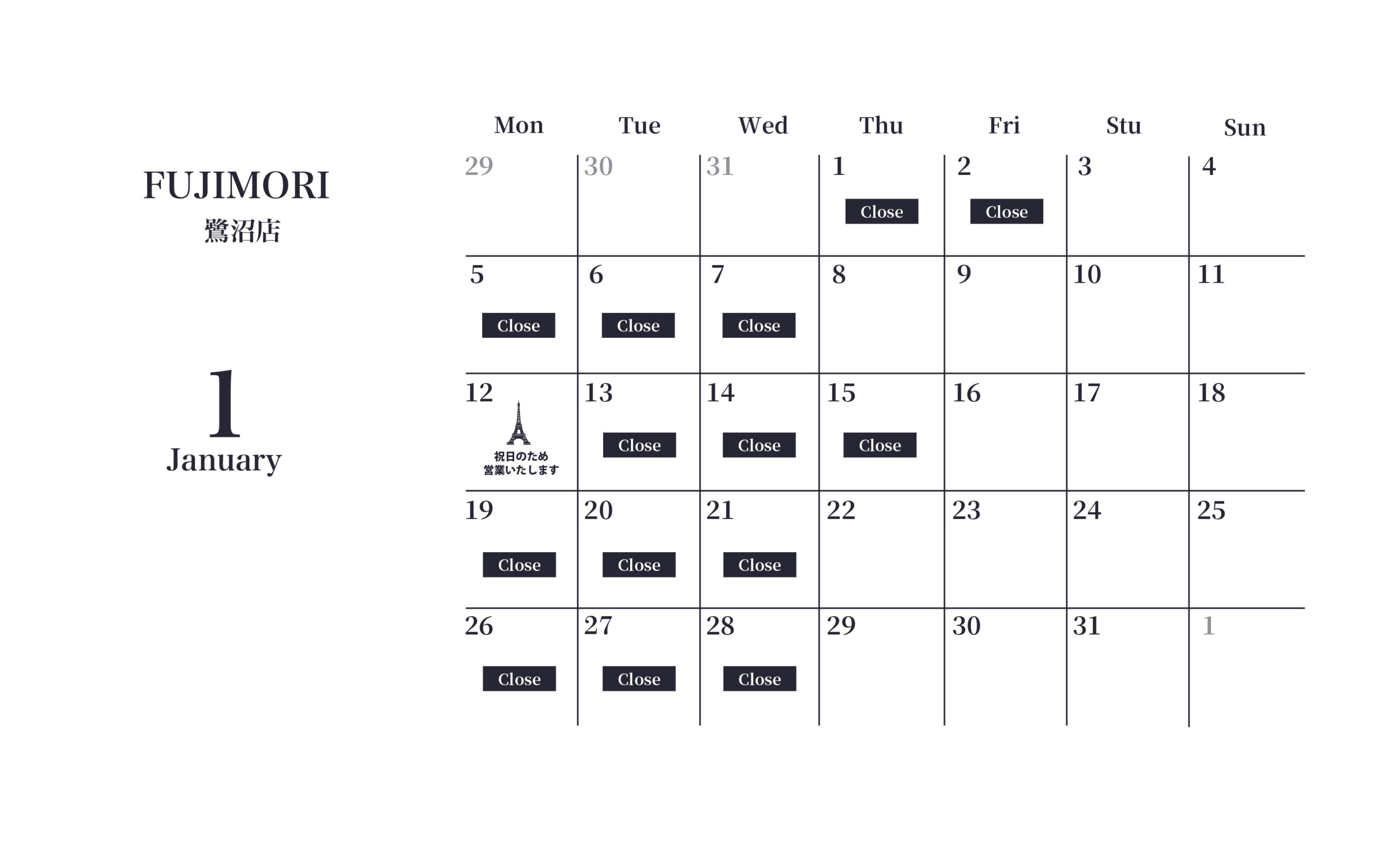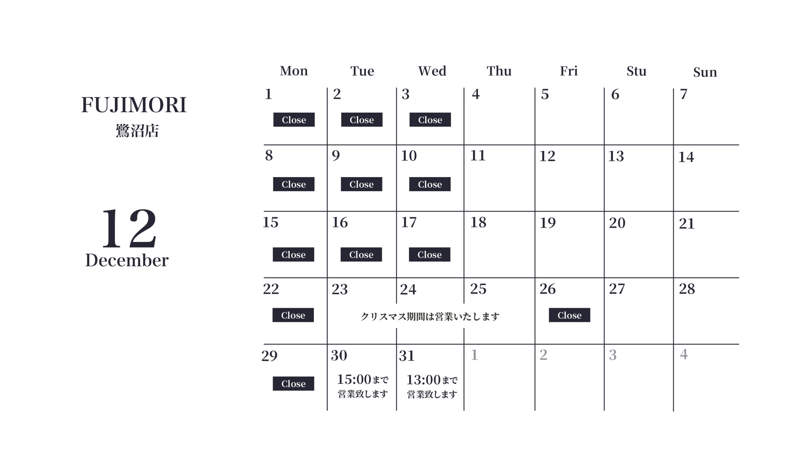◆ FUJIMORI鷺沼店のお休み